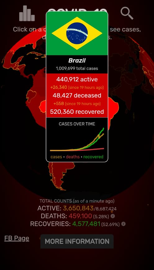 De acuerdo con este consorcio, que recopila los datos directamente en las secretarías regionales de Salud de los 27 estados del país, Brasil contabilizaba para la tarde de este viernes, 1.009.699 casos de contagio y 48.427 muertes por el nuevo coronavirus SARS-CoV-2.