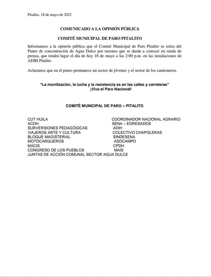 Mediante un corto comunicado, en el que se cita a rueda de prensa en las instalaciones de la ADIH a las 2:00 de la tarde, se ha manifestado, que el comité de paro Pitalito, se retira del punto ubicado en el cruce de Aguadulce en la salida de Pitalito sobre la ruta 45.