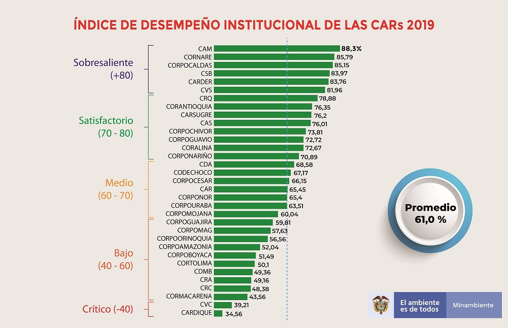 Las corporaciones que obtuvieron un porcentaje superior al 70% en su evaluación de desempeño integral y que alcanzaron una calificación sobresaliente fueron: 1. CAM del Huila con el 88.3%; 2. Cornare 85.79%; 3. Corpocaldas 85.15%; 4. CSB 83.97%; 5. Carder 83.79%; y 6. CVS 81.96%.