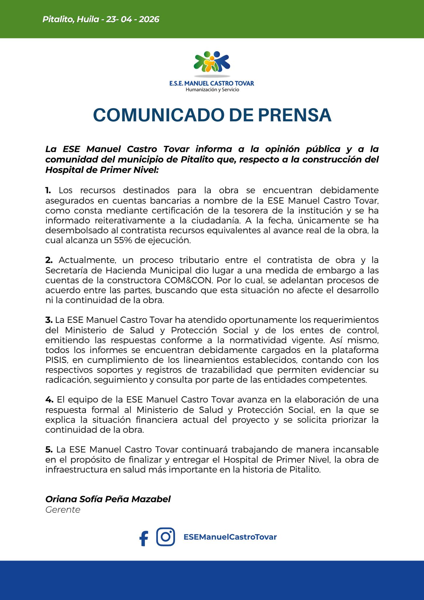 En respuesta, la gerencia de la ESE, liderada por Oriana Sofía Peña, asegura que la institución ha atendido oportunamente todos los requerimientos.