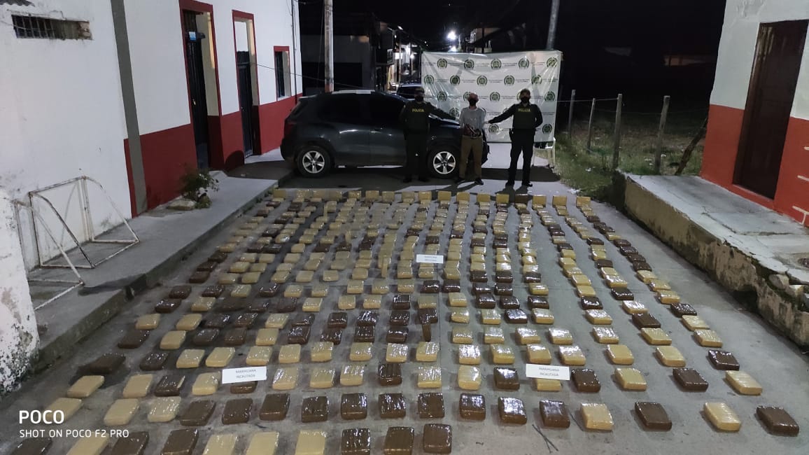 El día de ayer en horas de la tarde sobre la vereda la Palma, momentos después de que la patrulla del cuadrante realizara un puesto de registro, control y verificación de antecedentes; la comunidad del sector reportó un accidente de tránsito entre una camioneta Chevrolet Tracker y una motocicleta. Rápidamente los uniformados retornaron al sector, logrando evidenciar los nervios del conductor, por lo que revisaron el interior del vehículo, encontrando 7 tulas las cuales contenían 50 paquetes con 350 kilos de marihuana tipo “cripy”.