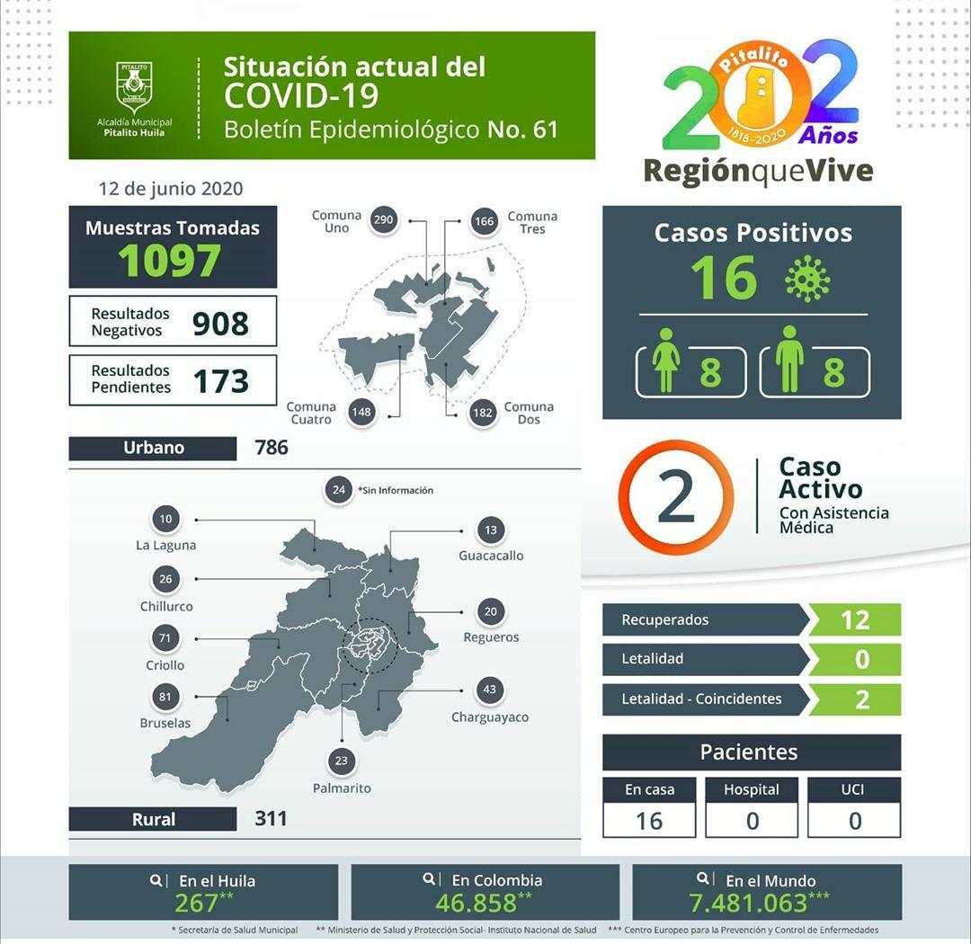 La Administración Municipal confirmó un nuevo caso de COVID-19 en Pitalito, según lo reportó el Boletín Epidemiológico número 61, el cual presenta los datos de hoy 12 de junio.