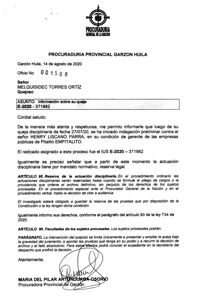 El contrato en su totalidad, ha sido denunciado ante la procuraduría, solicitando su investigación; una de las denuncias fue emitida por el abogado Melquisedec Torres, a quien se le notificó el día de ayer 24 de agosto la apertura de la INDAGACIÓN PRELIMINAR, en contra del gerente de Empitalito, Henry Liscano Parra por las presuntas irregularidades en torno al contrato de privatización del servicio de aseo.