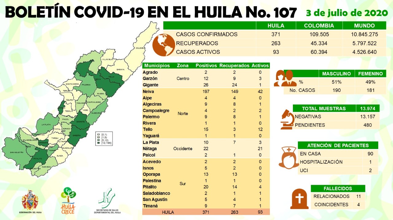 Se mantienen 93 casos activos en el territorio huilense, 90 de ellos en manejo ambulatorio con aislamiento obligatorio en su lugar de residencia y 3 pacientes hospitalizados.